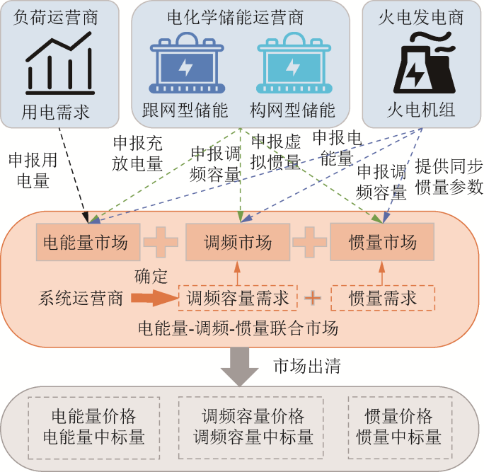 [Objective] In response to the high investment cost and long investment payback period when grid-forming energy storage is directly constructed in weak power systems, and in consideration of the value incentives of multiple markets, a decision-making method for the grid-forming transformation of electrochemical energy storage based on the existing grid-following electrochemical energy storage is proposed in the context of the electric energy-frequency regulation-inertia joint market. [Methods] Based on the trading framework of the electric energy-frequency regulation-inertia joint market which includes electrochemical energy storage, and from the perspective of electrochemical energy storage operators, a bilevel model for electrochemical energy storage integration in the joint market is established, taking into account the cost of grid-forming transformation of electrochemical energy storage. The upper-level model aims to maximize the revenue of energy storage for market trading and grid-forming transformation decisions. The lower-level model simulates the joint clearing process of the electric energy, frequency regulation, and inertia markets. To address the non-convexity of the lower-level market clearing caused by the start-up and shutdown states of thermal power units, the problem is relaxed and reconstructed using duality theory to transform it into a single-level mixed-integer programming problem for solution. [Results] The case study analysis indicates that, under the incentive of the value of multiple markets, the net revenue of electrochemical energy storage operators increased by 94 772.32 yuan after the grid-forming transformation, with an increase of as high as 73.5%, while the system operating cost decreased by about 0.2%. When the installed capacity of wind power in the system increased by 50%, the optimal proportion of grid-forming transformation of electrochemical energy storage operators increased from 29% to 64%, the increase in net revenue rose to 04,746.46 yuan, and the reduction in the total system operating cost increased to 85,667.39 yuan. [Conclusions] The method effectively incentivizes grid-following electrochemical energy storage systems to undergo grid-forming transformation, displacing high-marginal-cost thermal power units and thereby raising aggregate social welfare. As the share of renewable generation increases, the economic case for such transformation is further strengthened.